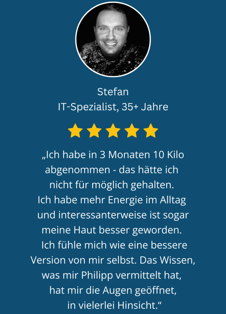 Stefan war beruflich wie privat stark eingespannt. Die Folgen: das Gewicht stieg, die Energie wurde weniger, Heißhunger wurde zum ständigen Begleiter. Gleichzeitig wuchs die Sorge um seine Gesundheit. Er spürte: So kann es nicht weitergehen. Doch ihm fehlten Struktur und Strategien im Ernährungsalltag, die wirklich zu ihm passten.