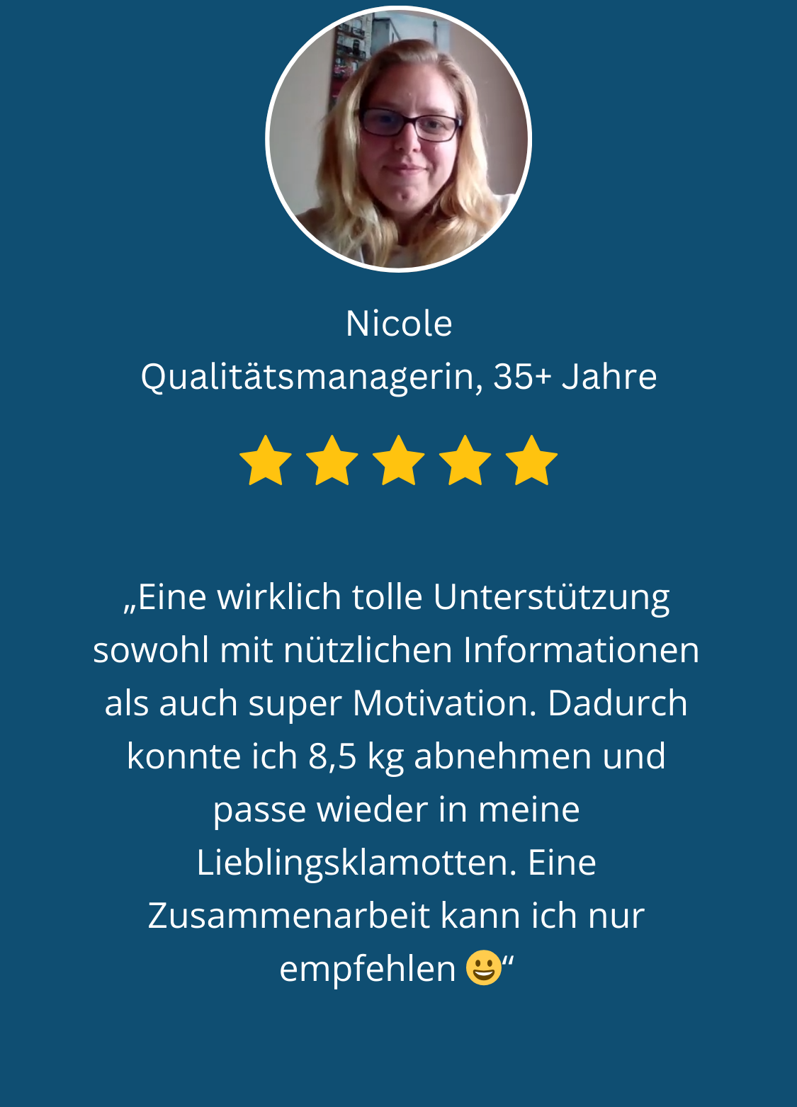 Wir stellten ihre Ernährungsweise schrittweise nach meinem System und auf ihre Vorlieben abgestimmt um. Nicole war überrascht, wie leicht sich Abnehmen anfühlen kann, weil ihre Kilos fast automatisch purzelten. Sie verstand in vielen Aha-Momenten warum frühere Versuche scheiterten. Durch klare Strategien und regelmäßige Unterstützung fand sie die Sicherheit, die ihr so lange gefehlt hatte.