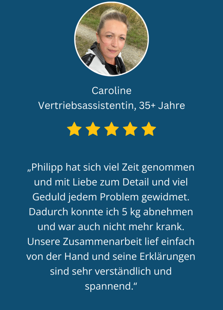 Im Coaching wurde ihr erstmals klar, wie stark Hormone, Gewohnheiten und emotionale Muster zusammenspielen. Viele Gespräche sorgten für echte Aha-Momente. Mein Abnehm-System haben wir individuell auf ihren Alltag abgestimmt. Sie lernte, welche Lebensmittel sie wirklich unterstützen, passte ihr Essverhalten intuitiv an und entwickelte neue Routinen, die zu Familie und Job passen.